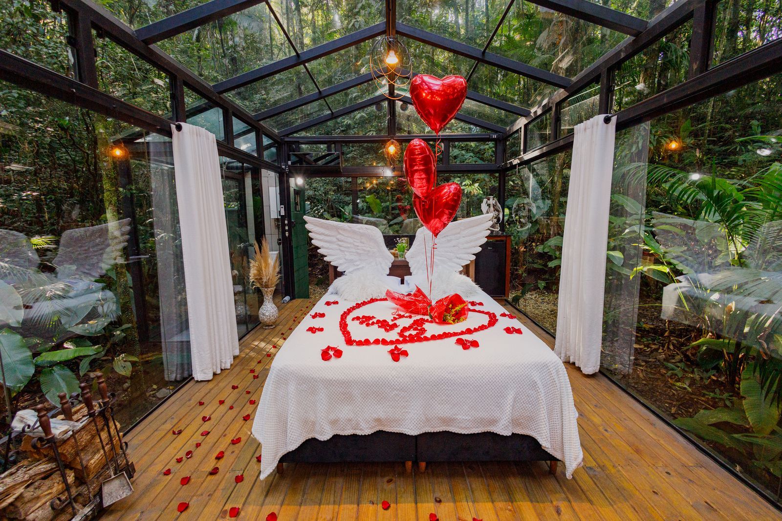 Cama de casal Queen Size, varanda com deck e ducha a gás com vista panorâmica. O espaço conta com uma elegante banheira vitoriana ao ar livre (com água quente e fria, ideal para 1 pessoa), lareira, ar-condicionado (quente e frio) e jogos de tabuleiro.